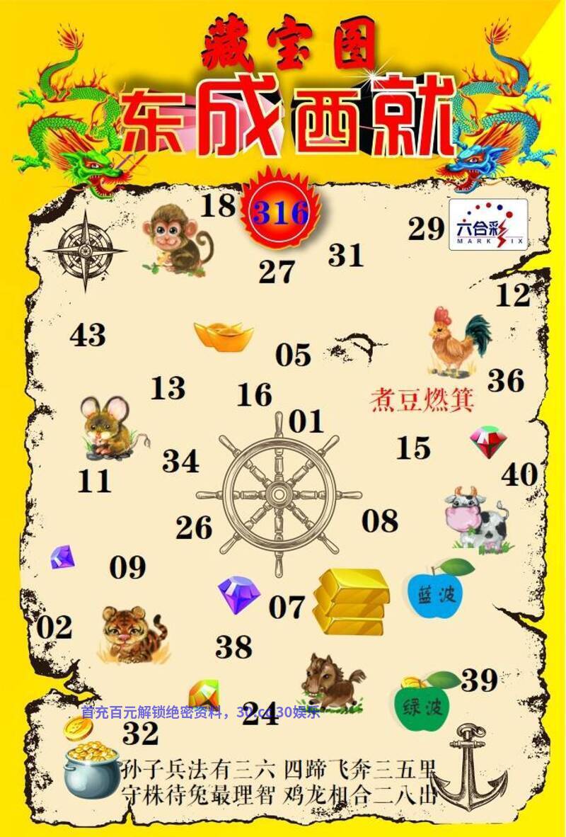 | 316期:解藏宝图【煮豆燃箕】 孙子兵法有三六四蹄飞奔三五里,守株待兔最理智鸡龙相合二八出。 综合六肖:猴鸡鼠牛虎马 |
